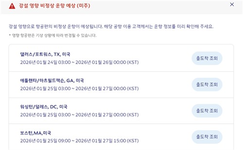 미국 '겨울 눈폭풍' 예보에…국적사 항공편 18편 결항미국 중부·동부 지역에 주말 사이 초강력 겨울 눈 폭풍이 예보되면서 미국 공항으로 오가는 국적 항공사들이 지금까지 10여편의 항공편 운항을 취소했습니다.항공업계에 따르면 오후 2시 30분(미국 동부 시각 24일 0시 30분) 기준