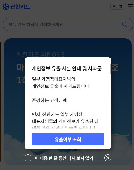 [속보] 신한카드, 가맹점 대표 휴대전화 번호 등 19만건 유출 신고신한카드가 일부 가맹점 대표의 개인정보가 유출됐다고 밝혔습니다.유출된 개인정보는 가맹점 대표 19만2천명의 휴대전화 번호로 일부 가맹점 대표의 경우 성명, 생년월일, 성별 정보가 포함돼 있습니다.이번 정보유출은 해킹 등 외부 침투