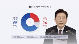 갤럽 "이 대통령 지지율 65%…국힘 최저"3주 연속 최고치 경신을 이어가던 이재명 대통령의 국정 지지율이 소폭 하락했다는 여론조사 결과가 나왔습니다.한국갤럽이 지난 24일부터 사흘간 전국 만 18세 이상 1,000명을 대상으로 조사한 결과, 이 대통령의 직무수행을 긍정