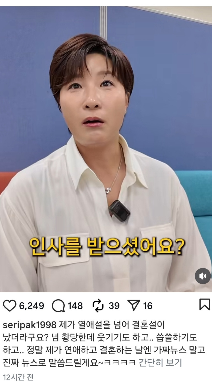 박세리, '김승수와 결혼설'에 "가짜 뉴스 황당"'골프 여제' 박세리가 배우 김승수와의 결혼설을 정면 부인했습니다.박세리는 자신의 인스타그램에 근황 영상을 올리며 "열애설을 넘어 결혼설이 났더라"며 "너무 황당한데 웃기기도 하고 씁쓸하다"고 말했습니다.이어 "정말 제가 연애하고