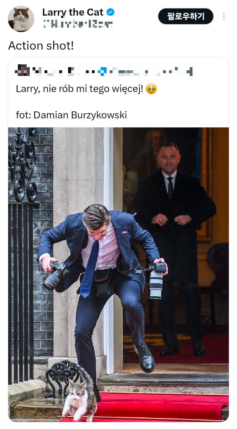 "어르신 길 막지 마"…영국 '총리실 냥이'한테 발 걸린 사진사최근 폴란드 대통령이 영국을 방문한 가운데, 그의 사진사가 영국 총리실 고양이에게 발이 걸리는 모습이 포착돼 큰 화제를 모으고 있습니다.13일(현지시간) 카롤 나브로츠키 폴란드 대통령은 키어 스타머 영국 총리와 만나기 위해 총리