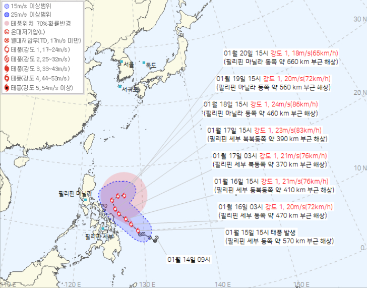 필리핀 동쪽 해상서 올해 1호 태풍 '노카엔' 발생오늘(15일) 오후 3시 필리핀 세부 동쪽 약 570㎞ 부근 해상에서 올해 1호 태풍 '노카엔'이 발생했습니다.태풍의 중심 최대 풍속은 초속 18m로 '강도 1'의 세력을 보이고 있습니다.태풍 '노카엔'은 강도 1의 세력을 유지한