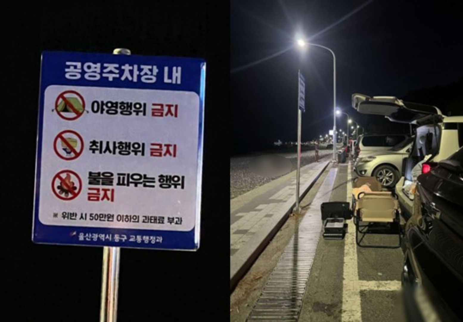 야영·취사가 금지된 울산 주전 몽돌해변 공영주차장에서 누군가 캠핑을 즐기는 모습이 포착돼 논란이 일고 있습니다.14일 한 온라인 커뮤니티에는 ‘울산 주전 몽돌해변, 캠핑 금지 안내판 앞 캠핑’이라는 제목의 게시물이 올라왔습니다.작