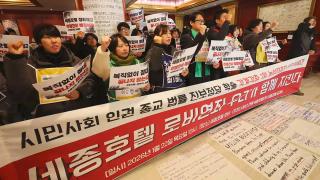 '복직 농성' 세종호텔 노동자 등 10여명 연행세종호텔 측에 복직을 요구하며 농성을 벌이던 해고 노동자들이 경찰에 업무방해 등의 혐의로 체포됐습니다.경찰은 업무방해와 퇴거불응 등 혐의로 '세종호텔 정리해고 철회를 위한 공동대책위원회' 운영위원 등 12명을 체포해 조사하고 있습