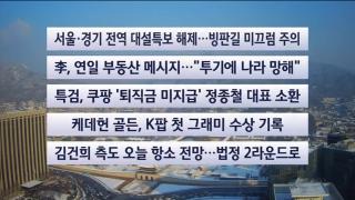 [이시각헤드라인] 2월 2일 뉴스센터■서울·경기 전역 대설특보 해제…빙판길 미끄럼 주의■2월 시작부터 전국에 폭설이 쏟아졌습니다.눈은 그쳤지만, 곳곳이 빙판으로 변해 미끄럼 사고 주의가 필요합니다.밤샘 제설작업으로 시내 도로 흐름은 평소 수준을 유지했지만, 대중교통