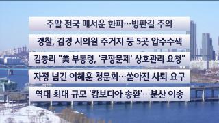 [이시각헤드라인] 1월 24일 토요와이드(11시)■주말 전국 매서운 한파…빙판길 주의■주말인 오늘도 매서운 추위가 이어지겠습니다.중부와 경북에 한파특보가 발효 중인 가운데, 이들 지역은 아침에 영하 10도 안팎까지 기온이 떨어지겠습니다.■경찰, 김경 시의원 주거지 등 5곳 압수