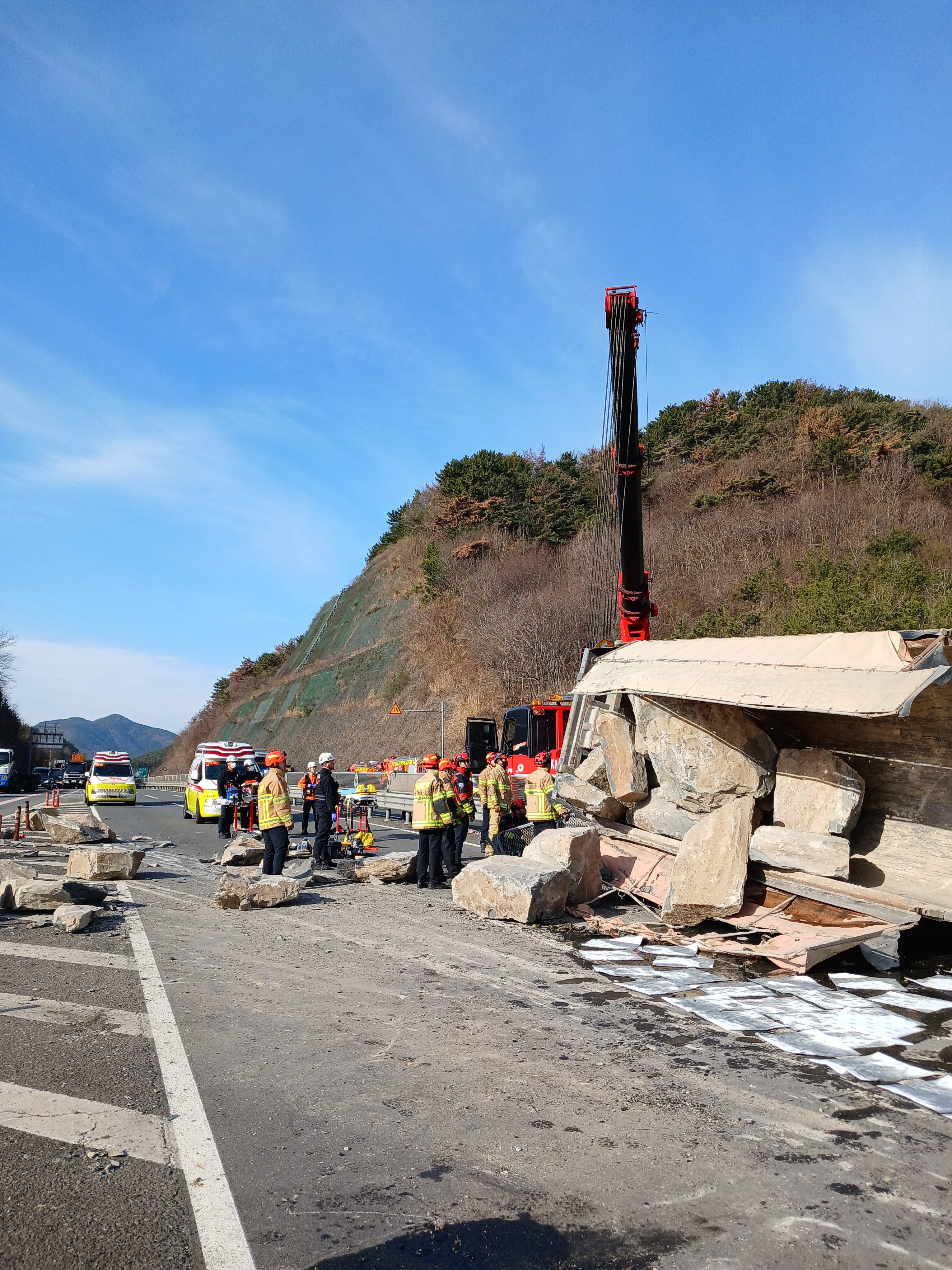창원서 18t 화물차 전도…석재 쏟아져 2명 부상오늘(20일) 오전 7시 10분쯤 경남 창원시 마산합포구 진북면 지산분기점 인근 도로에서 공사용 석재를 싣고 달리던 18t 화물차가 가드레일을 들이받고 넘어졌습니다.이 사고로 화물차 운전자와 반대편 차로를 지나던 승용차 운전자 등