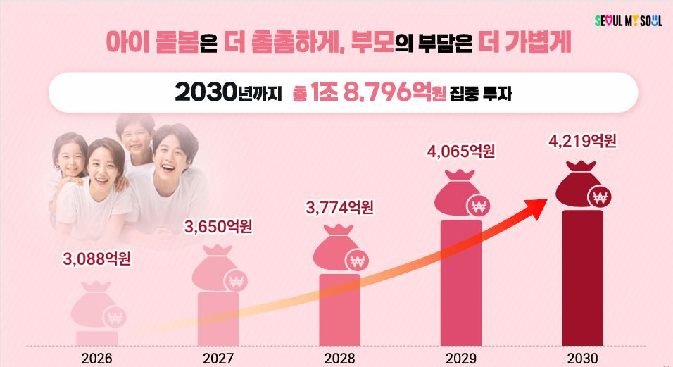 서울시가 기존 아이돌봄 체계를 한 단계 업그레이드한 '서울아이 동행(童幸) UP 프로젝트'를 발표했습니다.서울시는 '아이가 행복하고 부모는 안심하는 서울아이 돌봄체계 전면 개편'을 목표로 오는 2030년까지 5년 동안 1조 8,7