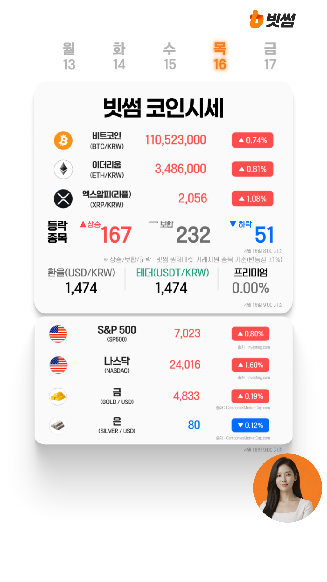 [코인시세] 미 증시 최고치 경신 속 비트코인 7만5천 달러 탈환가상자산 시장이 미 증시의 기록적인 강세에 힘입어 동반 상승세를 기록하고 있습니다.미·이란 간 지정학적 리스크 완화 기대감이 커지면서 자산 시장 전반에 온기가 확산되는 모습입니다.빗썸의 ‘AI코인시세’에 따르면 오늘(16일) 오전