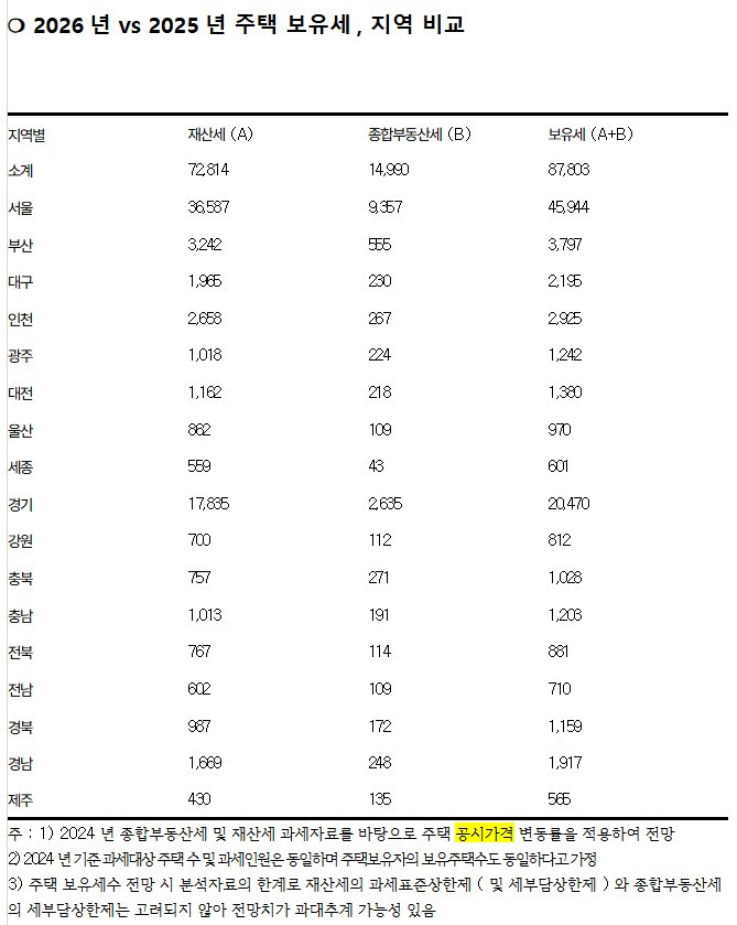 서울 공시가격 급등에…올해 주택 보유세수 1.1조원 증가할 듯올해 서울 주택 공시가격이 크게 오르면서 이를 기반으로 산출되는 주택 보유세수도 1조원 넘게 증가할 것이라는 전망이 나왔습니다.국회예산정책처가 국회 국토교통위원회 소속 국민의힘 이종욱 의원실에 제출한 '2026년 주택분 보유세수