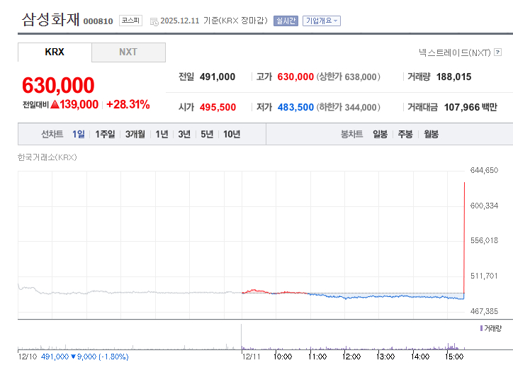 삼성화재, 정규장 마감 직전 28% 급등…'네 마녀의 날' 주문실수?삼성화재 주가가 오늘(11일) 장 마감 직전 갑작스레 상한가 수준으로 치솟아 눈길을 끌고 있습니다.한국거래소 정보데이터시스템에 따르면 삼성화재는 이날 전 거래일보다 13만9천원(28.31%) 급등한 63만원으로 거래를 마감했습니다