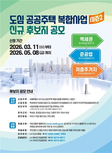 서울 노후 도심에 새 아파트 공급…국토부, '도심복합사업' 후보지 공모서울 노후 도심에 새 아파트를 공급하기 위한 도심 공공주택복합사업 신규 후보지 발굴이 3년 만에 다시 추진됩니다.국토교통부는 오는 11일부터 5월 8일까지 서울을 대상으로 도심복합사업 신규 후보지 신청을 받고, 6월 중 최종 후보