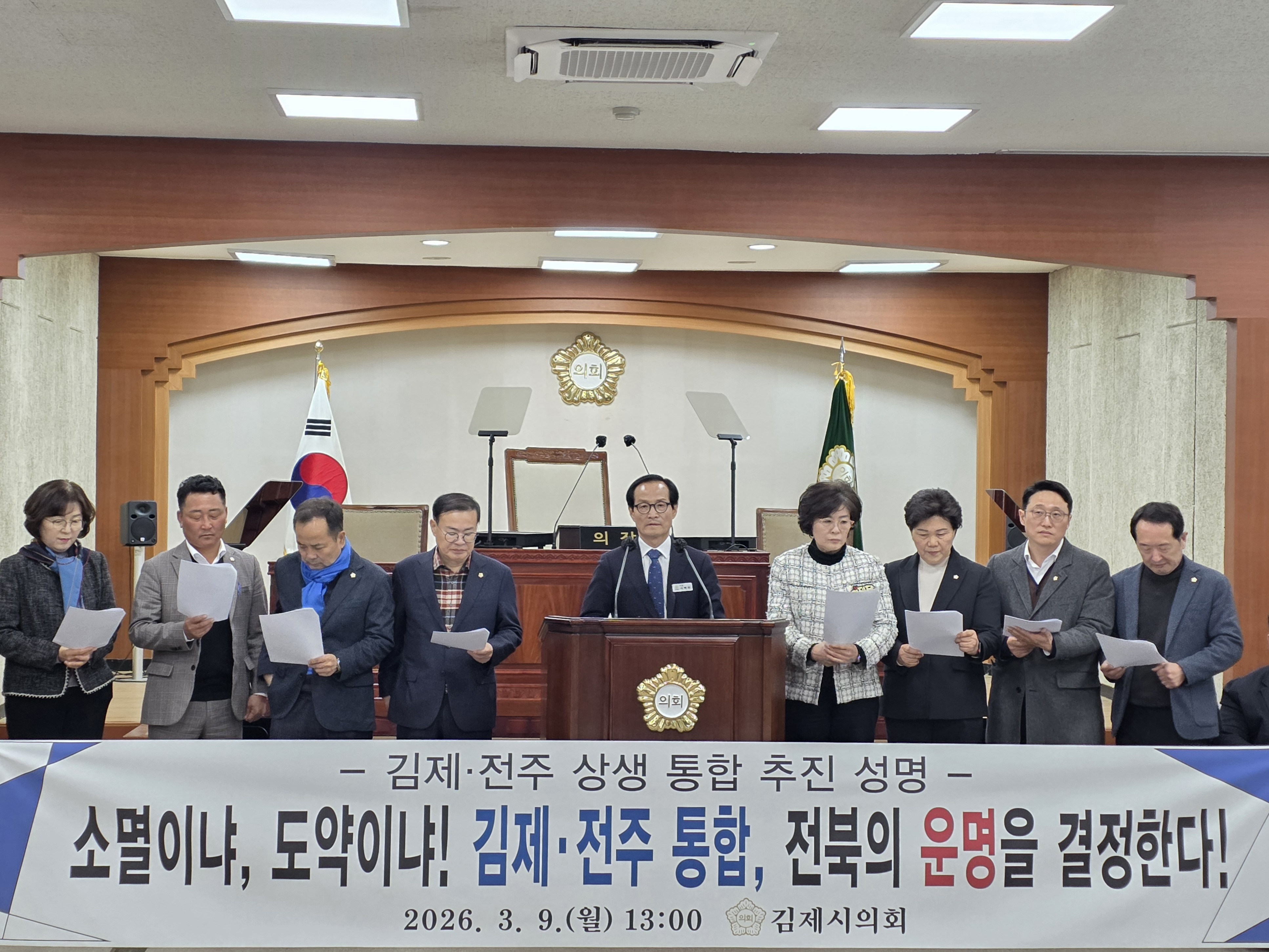 김제시의회, "김제전주통합추진위 구성 제안"전북 김제시의회가 지역 소멸 문제 해결을 위해 전주시와 행정 통합이 필요하다고 주장했습니다.김제시의회 의원들은 오늘(9일) 기자회견을 열고 "전북권의 소멸과 저발전의 복합 위기를 극복하는 필수 조건으로 김제시와 전주시의 통합 추진