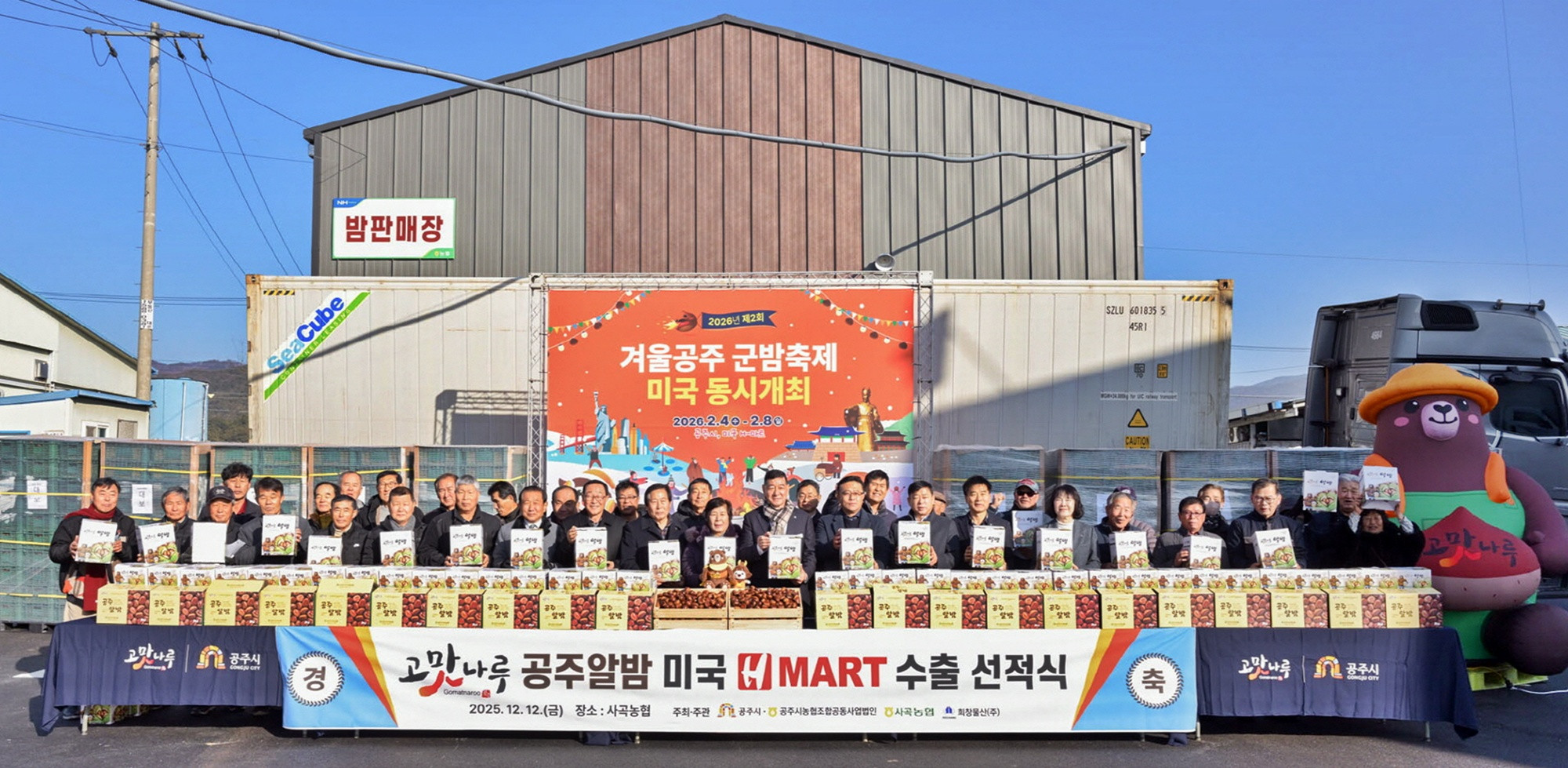 공주특산물 '고맛나루 알밤' 20t 미국 수출…올해 세번째충남 공주시 특산물인 '고맛나루 공주알밤'이 올해 세 번째로 미국 수출길에 올랐습니다.공주시는 오늘(12일) 사곡농협에서 최원철 시장과 황광환 농협 공주시지부장, 이택문 공주시 농협 조합공동사업법인 대표, 한갑수 농협경제지주 충남