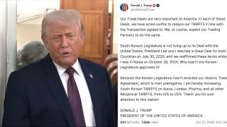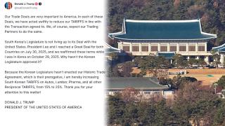 돌연 韓관세인상…트럼프, '대미투자 신속이행' 압박?도널드 트럼프 미국 대통령은 현지시간 26일 "한국 입법부가 역사적인 무역 합의를 입법화하지 않았다"며, 한국산 제품에 대한 관세를 15%에서 25%로 다시 올리겠다고 밝혔습니다.한국이 한미 관세협상의 후속 조치를 신속하게 이행하