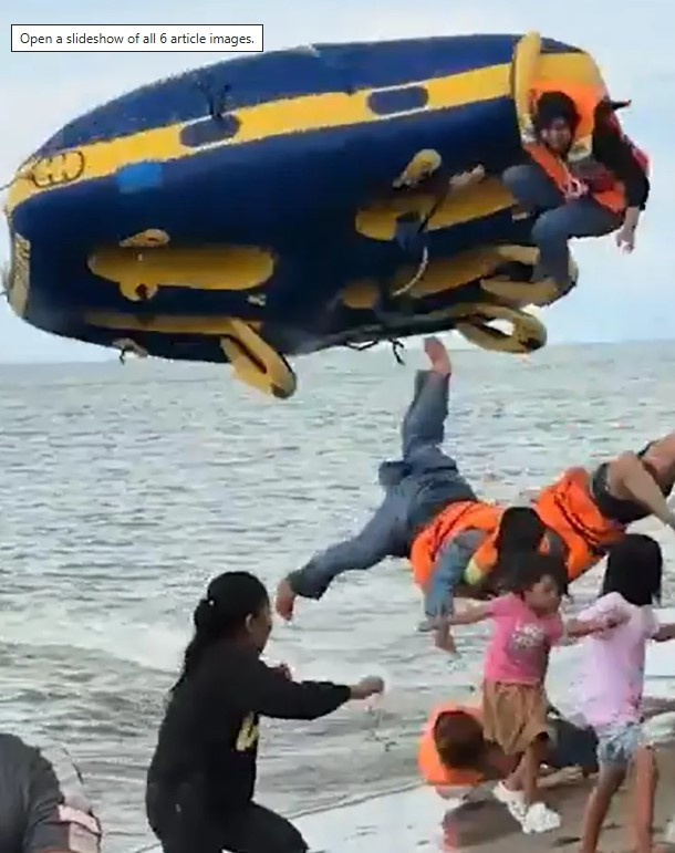바람도 없는데 해안가로 잘못 돌진…인니 '도넛 보트' 탑승객들 봉변인도네시아 남술라웨시의 한 해변에서 튜브 보트가 해안에 충돌하면서 관광객들이 다치는 사고가 발생했습니다.현지시간 6일 더 선에 따르면, 지난달 31일 판타이 하라판 암마니 해변에서 스피드보트에 연결된 일명 ‘도넛 보트’가 해안에