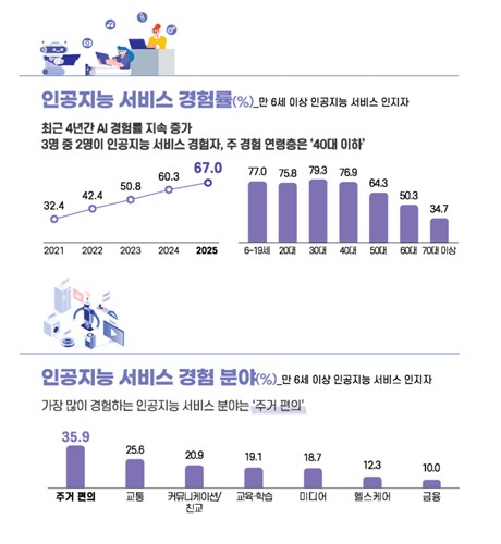 국민, 10명 중 4명은 AI 사용…일상·일터 모두 파고들었다국민 10명 중 4명 이상이 생성형 인공지능(AI) 서비스를 경험했으며, 일상에서 AI 서비스를 접한 비율은 4년 만에 2배 이상 늘어난 것으로 나타났습니다.과학기술정보통신부는 국내 가구와 개인의 인터넷 이용 환경 및 이용률, 이