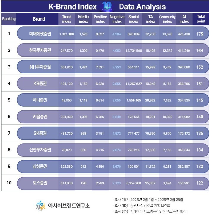 미래에셋, K-브랜드지수 증권사 부문 1위…삼성증권 9위 '털썩'빅데이터 평가 기관인 아시아브랜드연구소는 'K-브랜드지수' 증권사 부문 1위에 미래에셋증권이 선정됐다고 오늘(31일) 발표했습니다.이번 K-브랜드지수 증권사 부문은 증권사 상위 주요 기업 브랜드를 대상으로, 2026년 2월 1일부