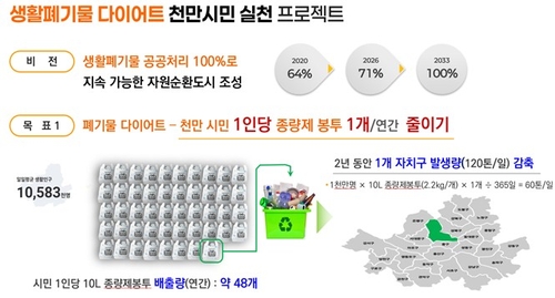 서울시, '쓰레기 다이어트' 추진…1명당 종량제봉투 1개 줄이기서울시가 이달부터 시민 1명당 연간 종량제봉투 1개 분량의 쓰레기를 줄이는 '생활폐기물 다이어트 천만 시민 실천 프로젝트'를 추진한다고 밝혔습니다.서울시민은 한 해 동안 10L 크기의 종량제봉투를 48개 분량의 생활폐기물을 배출하