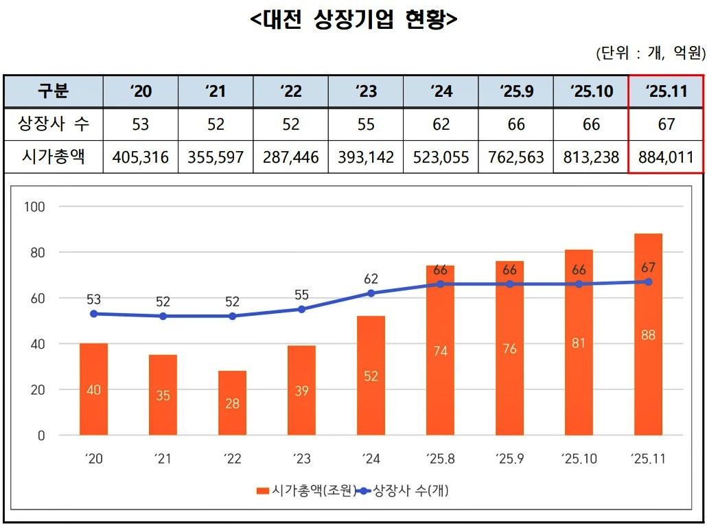 대전 상장기업 시총 첫 88조 돌파…코스닥 톱10에 4곳 포함첨단 바이오·AI 기업 질주하며 성장세…신규 상장 ‘노타’ 주목대전지역 상장기업의 시가총액이 처음으로 88조원을 넘어섰습니다.대전테크노파크(대전TP)는 지난달 말 기준 지역 상장기업 67개 사의 시가총액이 88조4,011억원으로