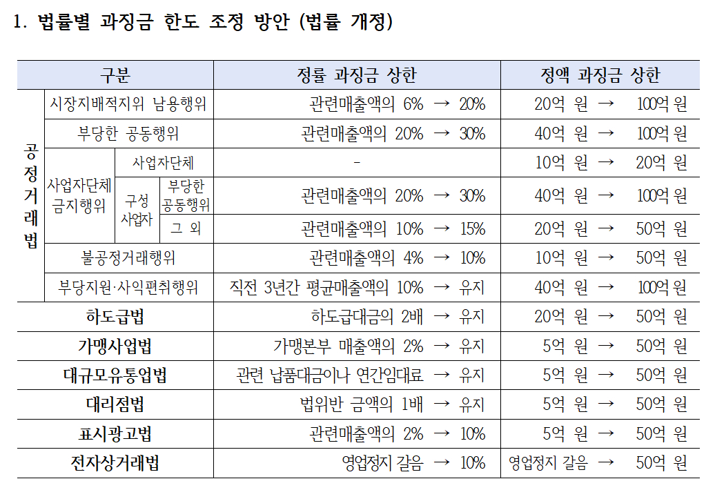 기업 형벌 대신 '과징금' 기준 대폭 상향…정액 과징금 최대 100억정부가 불공정거래 기업에 대한 금전적 제재인 과징금 제도를 대폭 강화한다고 밝혔습니다.앞서 정부와 더불어민주당이 '2차 경제형벌 합리화 방안'을 토대로 형벌 중심 관행에서 벗어겠다고 발표함에 따라, 법 위반 억지력이 약화될 가능성