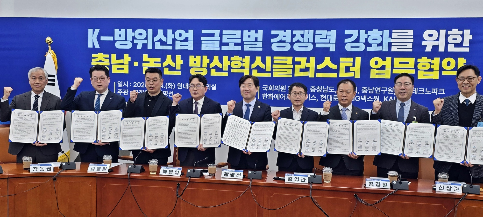 충남도·글로벌 방산기업 '방산클러스터 유치' 맞손K-방산 글로벌 경쟁력 강화·방산혁신클러스터 등 공모 참여 협력 약속충남도가 방산 혁신클러스터 유치를 위해 지역 국회의원, 글로벌 방산기업과 손을 잡았습니다.도는 오늘(24일) 국회에서 더불어민주당 황명선 의원, 논산시, 한화에어