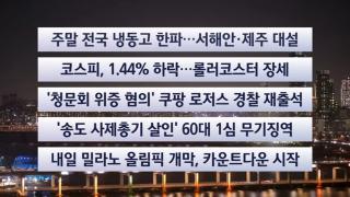 [이시각헤드라인] 2월 6일 뉴스투나잇■주말 전국 냉동고 한파…서해안·제주 대설■북쪽에서 찬 공기가 내려오면서 전국적으로 한파특보가 강화된 가운데, 주말 내내 동장군이 기승을 부릴 전망입니다.호남과 제주도에는 많은 눈도 내려 쌓일 전망입니다.■코스피, 1.44% 하락