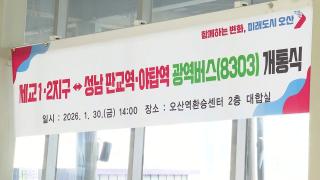 '오산 세교~성남 판교' 직행버스 다음주부터 운행경기 오산시는 세교1·2지구에서 성남 야탑역까지 운행하는 직행버스가다음 달 2일 오전 6시 30분 첫차부터 정식 운행을 시작한다고 밝혔습니다.오산시는 정식 운행에 앞서 오늘(30일) 오후 개통식을 열었습니다.신설되는 8303번 버