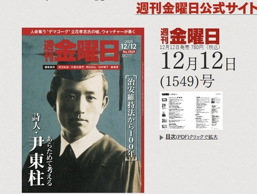 日 주간지, 시인 윤동주 조명…특집기사 게재진보 성향 일본 주간지가 80주기를 맞은 일제강점기 저항시인 윤동주를 집중 조명했습니다.'주간 금요일'은 지난 12일자로 펴낸 제1,549호에서 윤동주의 사진을 표지에 싣고, 다양한 특집기사를 게재했습니다.이 주간지는 "윤동주가