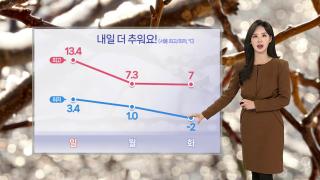 [날씨] 내일 찬바람 더 강해…서울 아침 기온 -2도온화했던 주말은 뒤로하고, 날이 부쩍 추워졌습니다.오늘 중부 곳곳은 영하권으로 출발했고, 낮에도 5도 안팎에 머물렀는데요.내일은 더 춥겠습니다.지난주만큼의 한겨울 추위는 아니지만, 전국 대부분 지역이 영하권을 보이겠고요.서울의 아