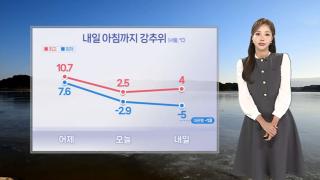 [날씨] 내일 더 춥다…아침 '서울 -5도' 겨울 추위북쪽에서 찬 공기가 내려오며, 날이 부쩍 추워졌습니다.이에 따라, 오늘 밤 9시를 기준으로 영남 지역에는 '한파주의보'가 발효되겠습니다.이번 추위는 내일 아침까지 이어지겠는데요.서울의 아침 기온은 영하 5도, 대관령은 무려 영하