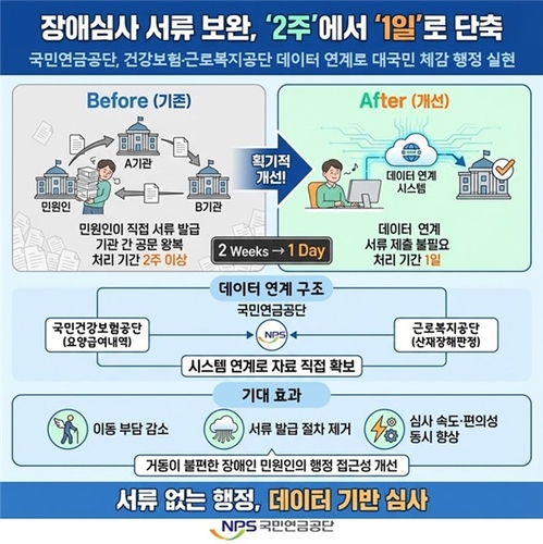연금공단, 장애 심사 서류 보완 기간 '2주→하루' 단축국민연금공단은 장애 정도 심사 과정에서 서류 보완 기간을 2주에서 하루로 단축했다고 오늘(6일) 밝혔습니다.해당 자료는 국민건강보험공단의 '요양급여내역'과 근로복지공단의 '산재장해판정' 자료입니다.이 자료들은 그동안 민원인이 직접