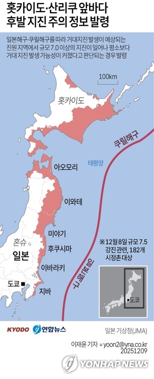 일본, 첫 후발지진 주의보 경계감 고조…"인공지진" 허위 정보도 확산일본 정부가 지난 8일 밤 혼슈 동북부 아오모리현 앞바다에서 발생한 규모 7.5의 강진을 계기로 '홋카이도·산리쿠 앞바다 후발 지진 주의 정보'를 처음 발령하면서 열도 내에서 경계감이 확산하고 있습니다.오늘(10일) 요미우리신문