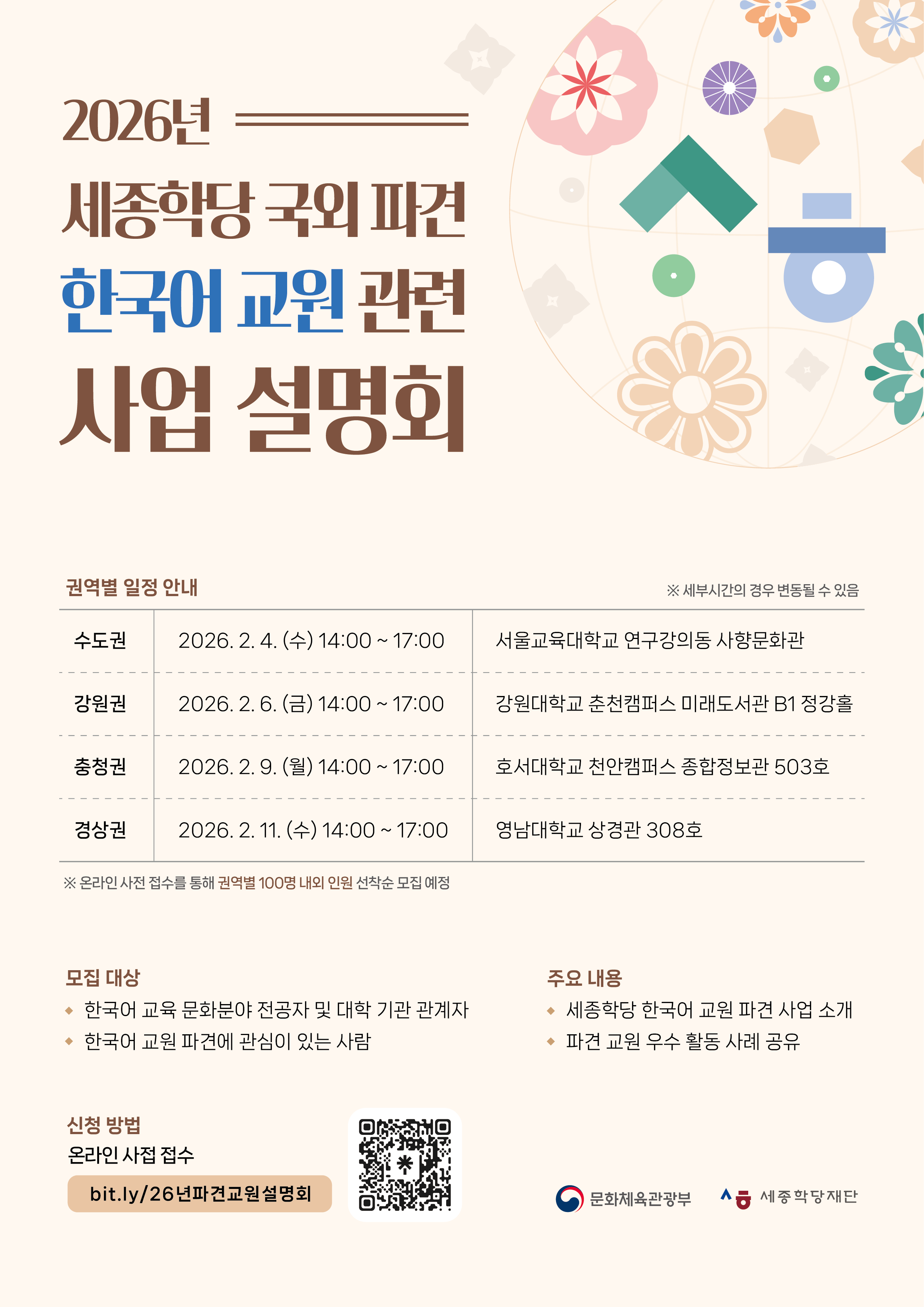 세종학당재단, 해외 파견 한국어 교원 설명회 개최세종학당재단이 해외에서 한국어를 가르칠 교원을 발굴하고 전문 인력을 육성하기 위한 국외 파견 한국어 교원 양성 사업 설명회를 엽니다.이번 설명회는 오는 2월 4일부터 11일까지 수도권과 강원, 충청, 경상 등 전국 4개 권역에서