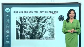 [날씨클릭] 전국 맑고 일교차 커…낮 기온 20도 안팎[앵커]오늘은 전국 하늘 맑게 드러나겠고요, 일교차가 크겠습니다.서쪽 지역은 공기질이 탁해지겠는데요.자세한 날씨는 기상캐스터와 함께 알아보겠습니다.진연지 캐스터, 어제는 서울 벚꽃이 공식 만발했다고요?[캐스터]맞습니다.어제 서울