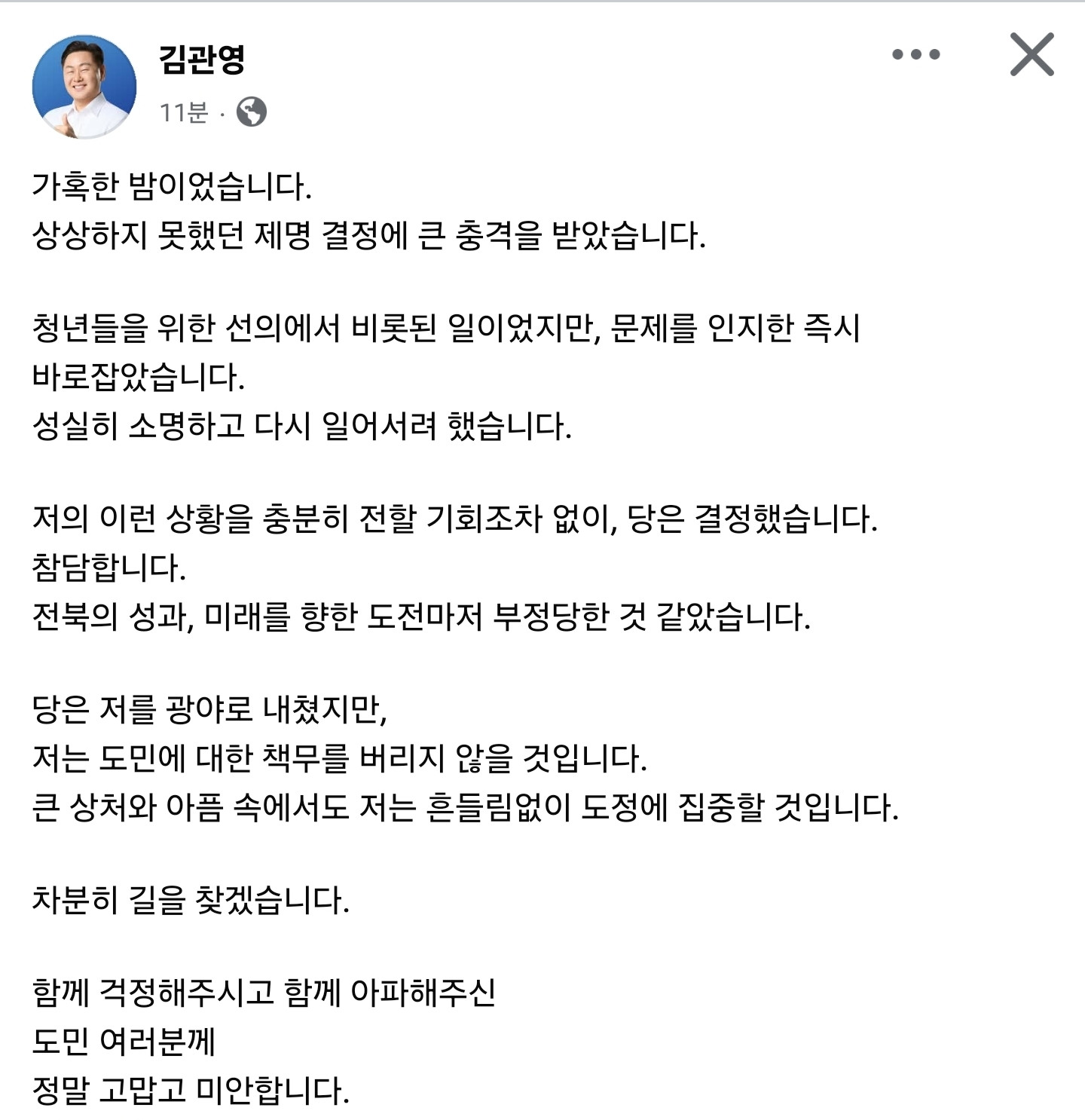 민주당 제명 김관영 전북지사 "흔들림 없이 도정 집중"현금 살포 의혹으로 더불어민주당으로부터 제명 처리를 받은 김관영 전북특별자치도지사가 도정을 계속 이어가겠다는 의지를 밝혔습니다.김 지사는 오늘(2일) 자신의 SNS에 "당은 저를 광야로 내쳤지만, 저는 도민에 대한 책무를 버리지
