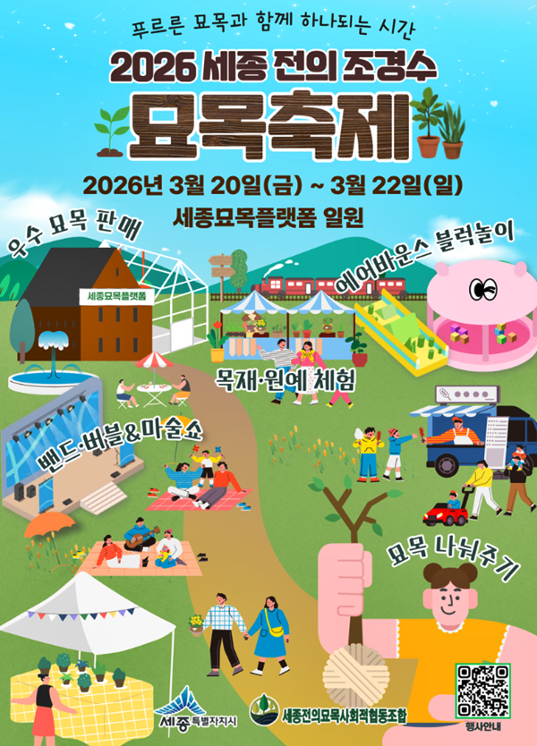 '세종시 전의 묘목 매력 한눈에'…제19회 묘목축제 개막사흘간 묘목 판매…다양한 체험 프로그램도 운영세종시가 전의면 일대에서 재배하는 묘목의 우수성을 널리 알리기 위해 오늘(20일) 전의면 세종묘목플랫폼 일원에서 '제19회 세종 조경수 묘목축제' 개막식을 하고 사흘간의 일정에 들어갔습