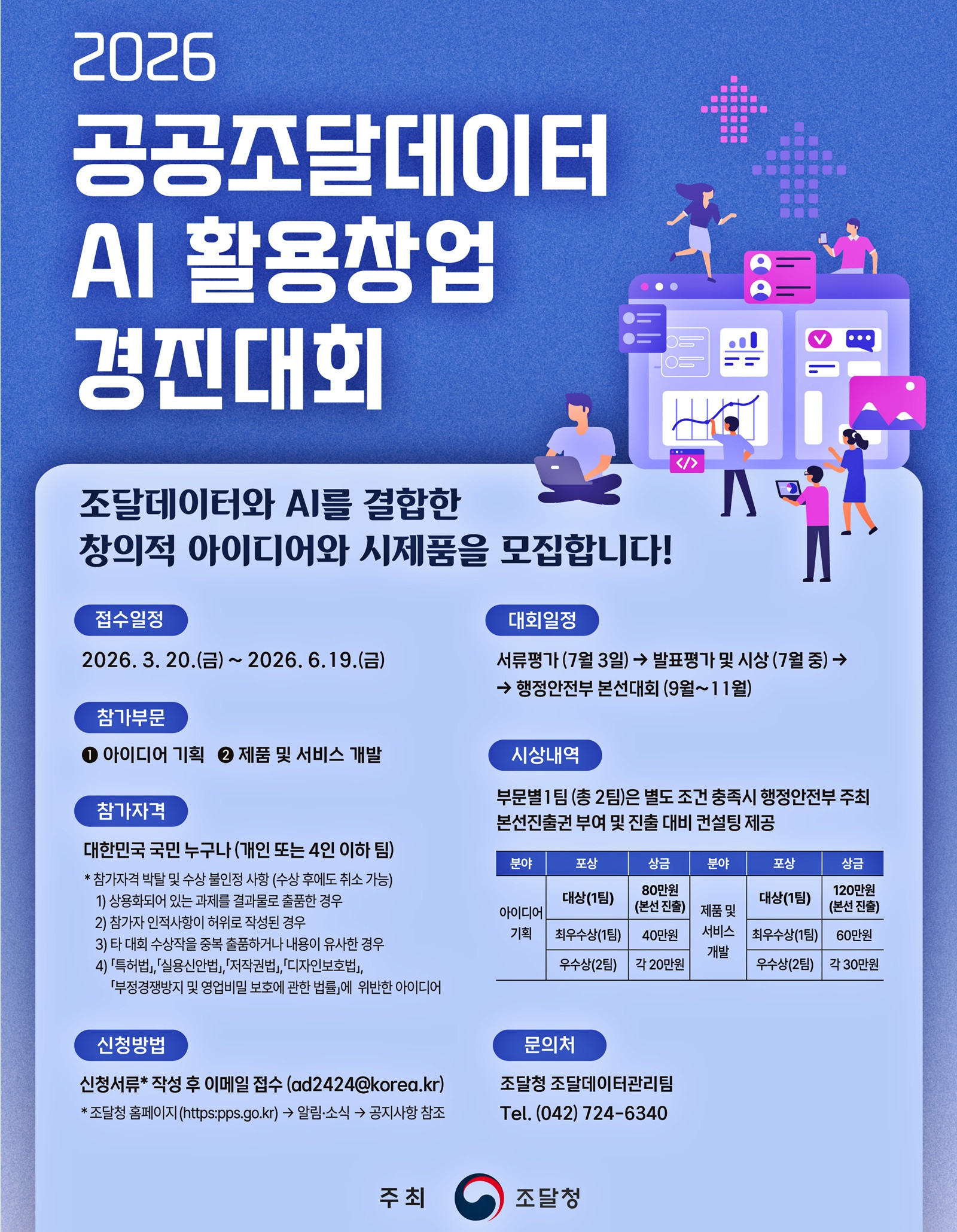 "조달데이터 가치 AI로 발굴" 조달청, 예비창업자 모집아이디어 기획, 제품·서비스 개발 등 2개 부문에 8개팀 포상조달청은 오늘(20일) '2026 공공조달데이터·인공지능(AI) 활용 창업경진대회' 계획을 공고하고 오는 6월 19일까지 참가 신청을 받는다고 밝혔습니다.이번 경진대회는