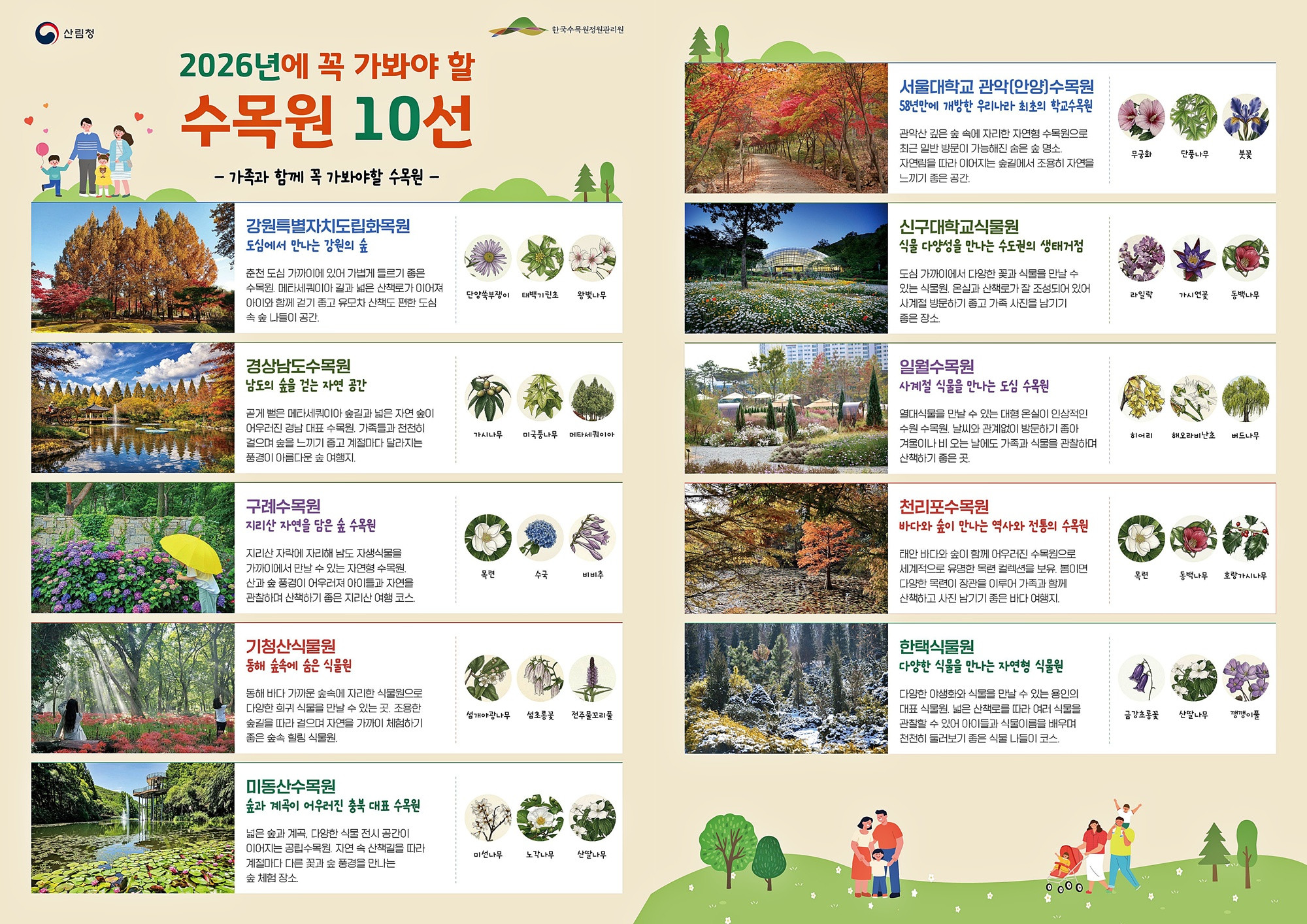 "수목원서 가족과 함께 멋진 추억을" 산림청, 수목원 10선 선정산림청은 가족과 함께 자연을 체험하며 즐길 수 있는 '올해 꼭 가봐야 할 수목원 10선'을 선정했다고 오늘(20일) 밝혔습니다.이번에 선정된 수목원은 강원도립(춘천), 경남수목원(진주), 구례수목원(전남 구례), 기청산식물원(경북