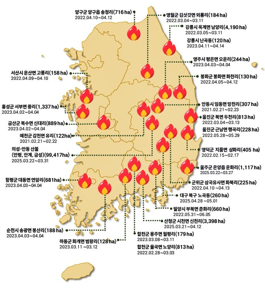 "대형산불 '안전지대' 없다…전국 산림 어디서나 발생 가능"산림과학원, 최근 5년간 발생한 대형산불 사례 분석산림청 국립산림과학원은 최근 5년간 발생한 대형산불의 발생 위치와 산림 유형 분포를 분석한 결과 대형산불이 특정 지역이나 수종에 집중되지 않고 다양한 산림 유형에서 발생한 것으로