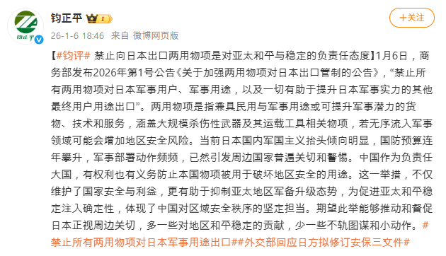 중국군, 이중용도 물자 수출 금지 정당화… “日군사력 확장 대응 조치”중국군이 일본을 겨냥한 이중용도 물자 수출 금지 조치에 대해 일본의 군사력 증강에 대응한 조치라는 입장을 공식화했습니다.중국인민해방군 뉴스전파센터가 운영하는 계정 ‘쥔정핑’은 어제(6일) 웨이보에서 해당 조치가 아시아·태평양 평화