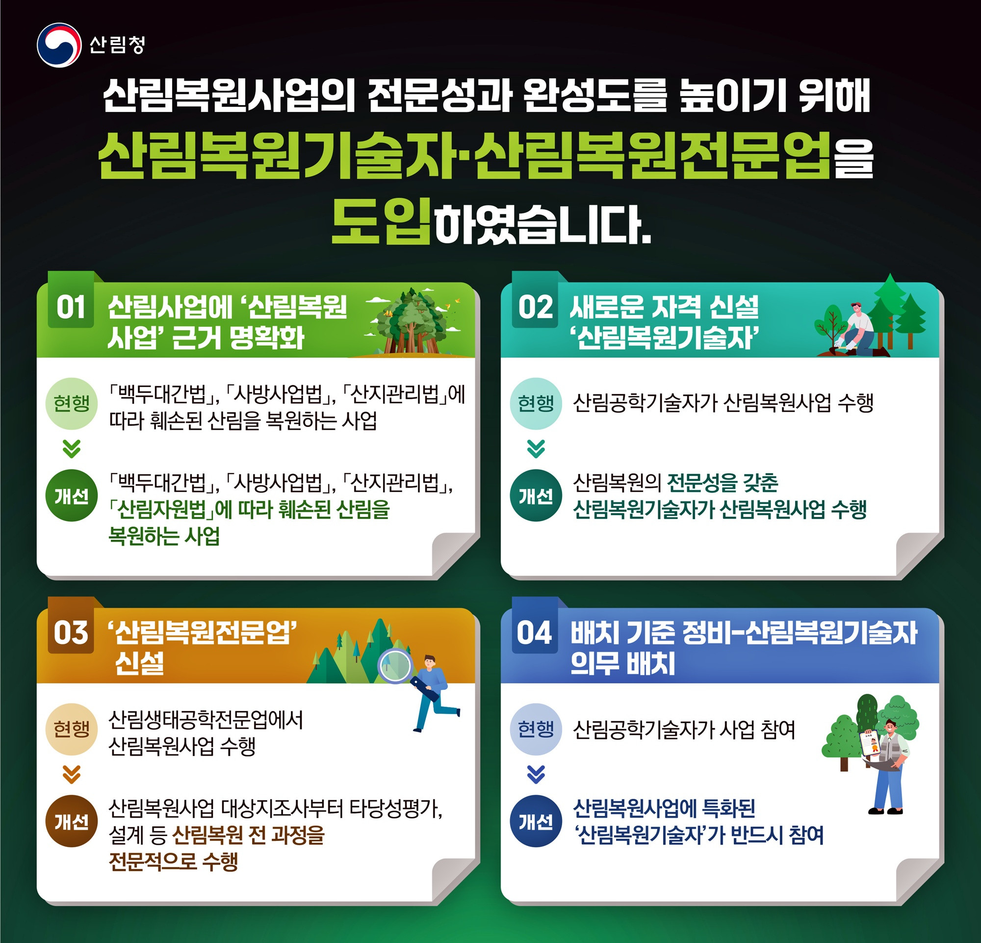 "산림복원 전문성 강화" 산림청, 산림복원 전문인력제 도입산림청은 대형산불과 산사태 등으로 증가하는 산림복원 수요에 체계적으로 대응하고 산림복원사업의 전문성을 강화하기 위해 '산림기술 진흥 및 관리에 관한 법률 시행령'을 일부 개정했다고 오늘(7일) 밝혔습니다.이번 시행령 개정으로 산림