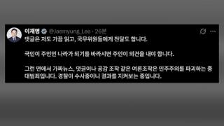 이 대통령 "가끔 댓글 읽어…여론조작 중대 범죄"이재명 대통령이 자신도 인터넷상의 댓글을 종종 읽는다며 '댓글 조작' 범죄의 중대성을 재차 지적했습니다.이 대통령은 오늘(18일) SNS에서 한 누리꾼이 올린 게시글을 인용한 뒤 "댓글은 저도 가끔 읽고, 국무위원들에게 전달도 한