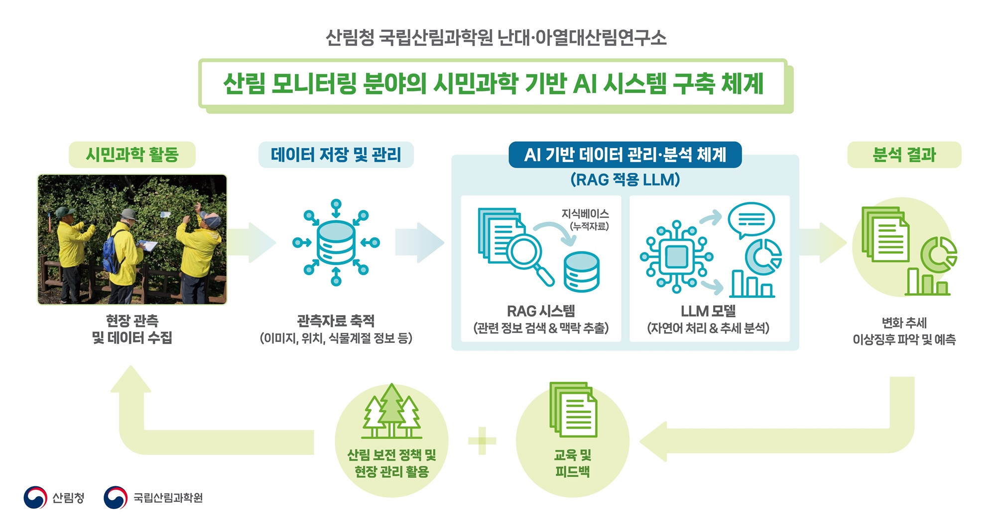 "시니어 시민과학자 만난 AI, 제주숲 보전의 '눈'으로"산림과학원, AI 기반 산림 데이터 관리·분석 시스템 개발산림청 국립산림과학원은 제주지역의 산림생태 데이터를 체계적으로 관리, 분석하기 위해 대규모 언어모델(LLM)과 검색증강생성(RAG) 기술을 적용한 '인공지능(AI) 기반 산