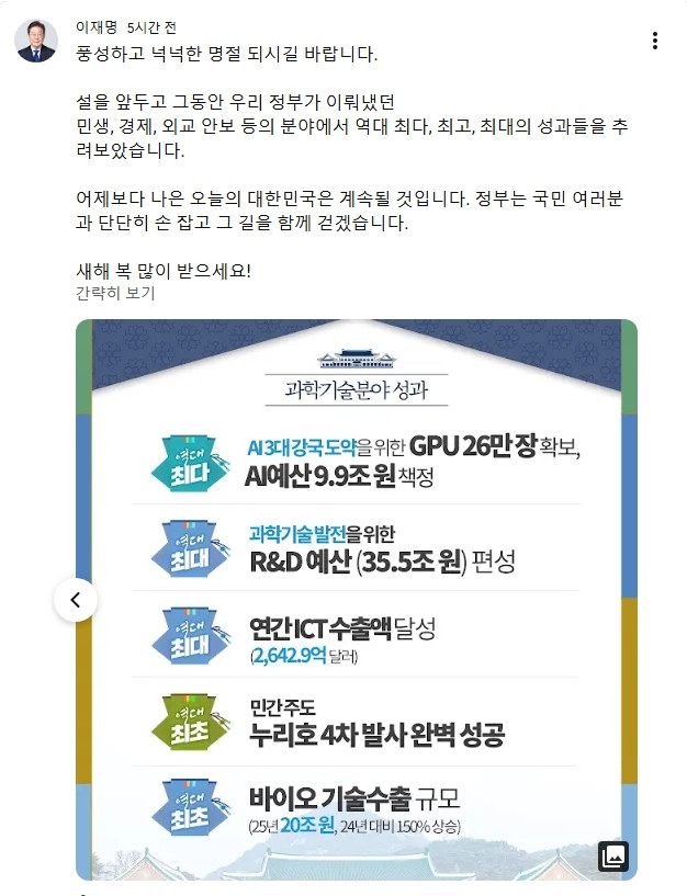 이 대통령 "최다·최고·최대 성과 추렸다"…경제 분야는 '코스피 최고치 경신' 제시이재명 대통령이 설 연휴 둘째 날을 맞아 정부가 이룩한 성과들을 직접 공개했습니다.이 대통령은 오늘(15일) 유튜브 커뮤니티에 "설을 앞두고 그동안 우리 정부가 이뤄냈던 민생과 경제, 외교 안보 등의 분야에서 역대 최다, 최고,
