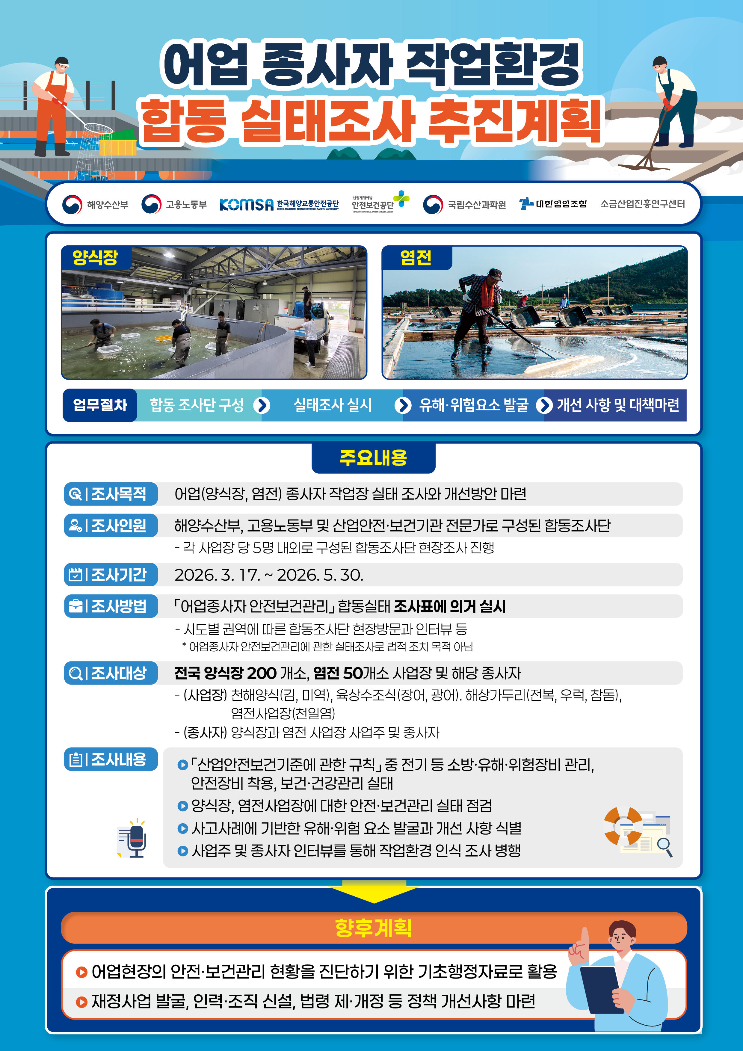 해수부·노동부, 양식장·염전 250곳 작업환경 실태조사해양수산부와 고용노동부는 양식장과 염전에서 일하는 어업 종사자의 안전·보건 작업환경을 점검하기 위해 합동 실태조사를 실시한다고 오늘(16일 )밝혔습니다.조사는 오는 17일부터 5월 30일까지 전국 양식장과 염전 등 250개 사업장