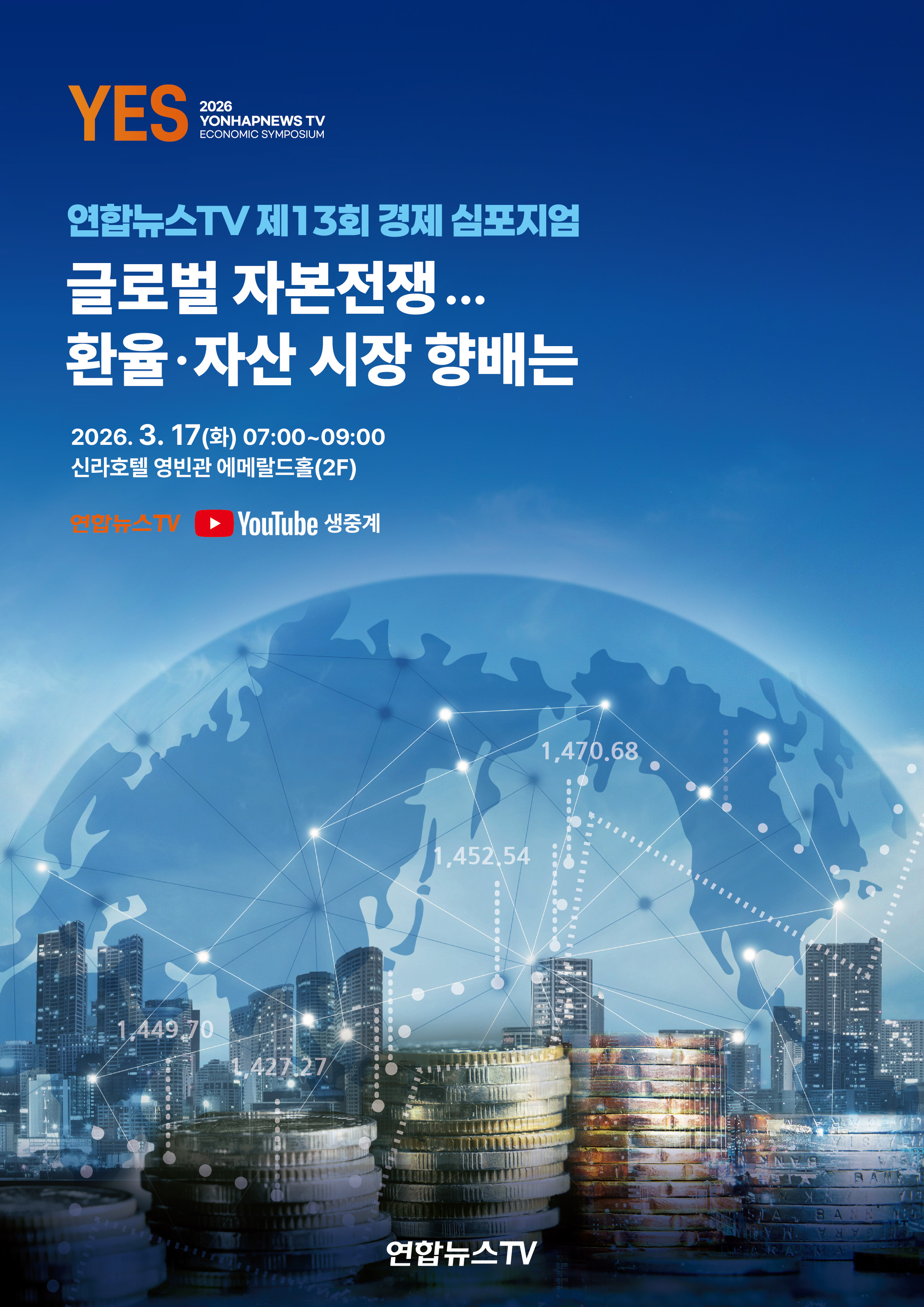 연합뉴스TV 경제 심포지엄 개최…‘글로벌 자본전쟁...환율·자산 시장 향배는’연합뉴스TV(채널23)는 오는 17일 서울 신라호텔 영빈관 에메랄드홀에서 '글로벌 자본전쟁...환율·자산 시장 향배는'을 주제로 경제 심포지엄을 개최합니다.올해 13회째를 맞은 연합뉴스TV 경제 심포지엄은 미국과 이란 전쟁을 비롯