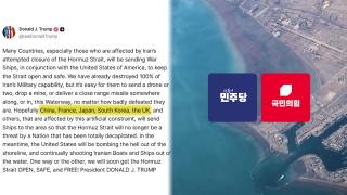 미 에너지장관 "韓등 호르무즈 해협 관련 협력 논리적"도널드 트럼프 대통령이 호르무즈 해협에 한국을 비롯한 5개국에 군함 파견을 사실상 요청한 것과 관련해 크리스 라이트 미 에너지부 장관은 "세계 여러 나라가 참여하는 광범위한 연합이 해협을 다시 열고자 협력하는 것은 상당히 논리적인
