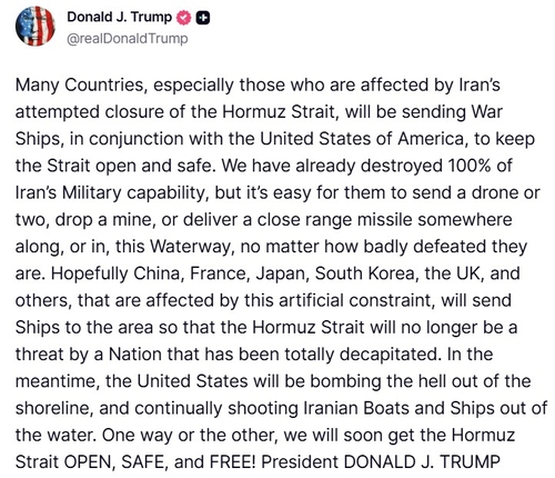 트럼프 "한국 등 호르무즈 봉쇄 영향받는 국가들, 군함 보내길"도널드 트럼프 미국 대통령이 현지시간 14일, 한국을 비롯한 5개국에 대해 호르무즈 해협에 함정을 파견할 것을 요구했습니다.트럼프 대통령은 소셜미디어 트루스소셜에 올린 글에서 "이란의 호르무즈 해협 봉쇄 시도에 영향을 받는 국가들