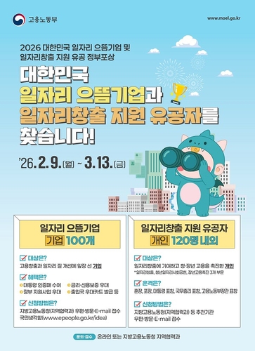 좋은 일자리 창출 '으뜸기업'·유공자' 추천·신청 접수고용노동부가 올해 '대한민국 일자리 으뜸기업'과 '일자리 창출 지원 유공 정부포상' 추천서 및 신청서를 접수한다고 밝혔습니다.일자리 으뜸기업은 일자리 창출과 일·생활 균형 실천 등 일자리 개선을 위해 노력한 기업이 대상이다. 매년